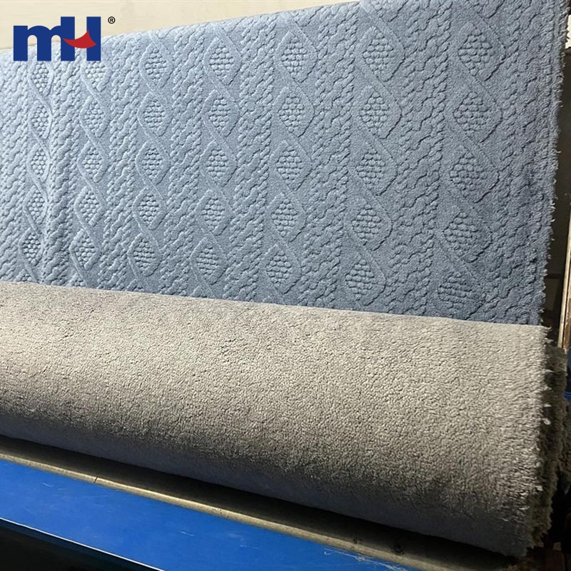 - Cara exterior: felpa jacquard de punto por trama (acabado con relieve y efecto “coco”), hilo 150D/288F DTY.